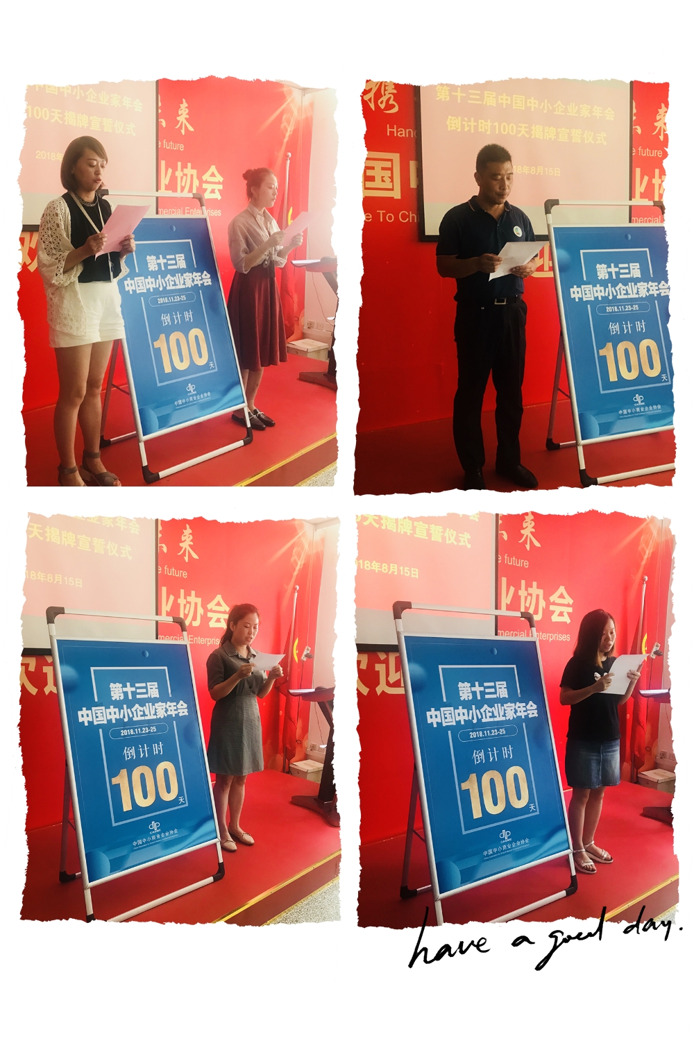 8月15日上午,中国中小商业企业协会举办了2018第十三届中国中小企业家年会倒计时100天揭牌宣誓仪式。协会副会长鲍鑫毳及各部门、分支机构代表共同为第十三届中国中小企业家年会倒计时100天揭牌。协会各部门、分支机构代表围绕年会事宜分别宣读年会工作誓言。年会人满怀激情,以昂扬斗志、务实态度、无所畏惧和挑战极限的精神,以不忘初心再出发、抓好转型促升级,做好企业服务助发展的理念,编写年会华丽新篇章。倒计时100天的揭牌与工作誓言的宣读也意味着第十三届年会步入紧张的筹备工作阶段。