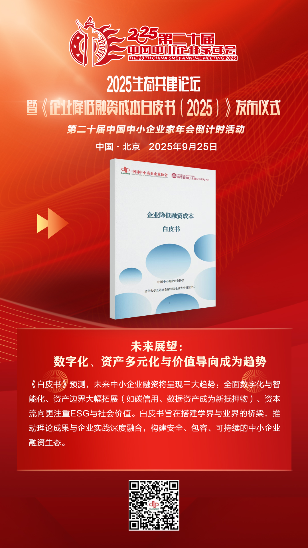9月25日,第二十届中国中小企业家年会倒计时活动——2025生态共建论坛暨《企业降低融资成本白皮书(2025)》发布仪式在北京举行。清华大学五道口金融学院金融安全研究中心主任周道许与中国中小商业企业协会副书记陈建煌共同为《白皮书》揭幕。该《白皮书》发布,不仅为中小企业提供了实战指南,也为政策制定者、金融机构与科技平台提供了协同创新的框架。